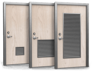 2. Wood: Solid-core wood doors can feature wood or metal louver inserts. These are often used in office buildings, schools, or restrooms where aesthetics are important along with ventilation. See commercial wood doors with louvers.