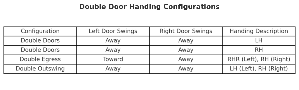| Double Outswing | LH | RH | Both leaves swing away from the room |