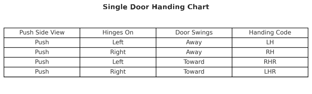 Door handing refers to the direction a door swings and which side the hinges are on when viewed from a specific reference point. In commercial construction, handing is always determined from the push side of the door (the side where you push the door to open it).